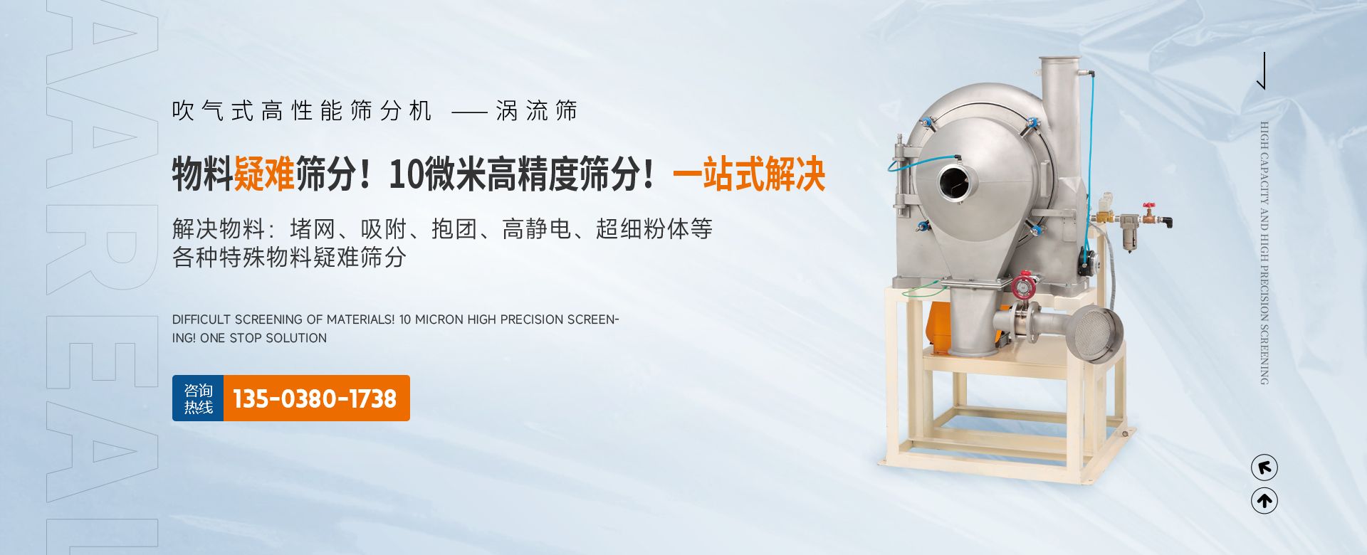 阿 瑞 爾(AAREAL)? 是從事篩分·過濾設(shè)備設(shè)計(jì)和制造的高新技術(shù)企業(yè),擁有先進(jìn)的生產(chǎn)設(shè)備、粉體篩分分析實(shí)驗(yàn)室,在中國(guó)廣州市設(shè)辦事處。祝賀:新鄉(xiāng)市超大產(chǎn)能精細(xì)篩分技術(shù)工程中心在阿瑞爾(AAREAL)成立!!!在線大產(chǎn)能篩分和在線動(dòng)態(tài)過濾是阿 瑞 爾(AAREAL)?的產(chǎn)品特點(diǎn)■ 在線大產(chǎn)能篩分,突破了傳統(tǒng)篩分觀念,工業(yè)化篩分,實(shí)現(xiàn)大產(chǎn)能、高能效篩分。以低故障率、低停機(jī)率、低使用成本、高產(chǎn)能、高精度、高能效為您帶來巨大意外收益。■ 阿瑞爾(AAREAL)擁有的回轉(zhuǎn)篩分技術(shù),擁有的近百種篩分解決方案及上千種物料的篩分經(jīng)驗(yàn),會(huì)給您展現(xiàn)全新的篩分設(shè)備,幫您實(shí)現(xiàn)大產(chǎn)能篩分 高精度篩分 疑難篩分。■ 阿瑞爾(AAREAL)的品質(zhì)保證:阿 瑞 爾(AAREAL)? 是高品質(zhì)篩分設(shè)備制造商高品質(zhì)是阿 瑞 爾(AAREAL)? 質(zhì)量準(zhǔn)則。優(yōu)品設(shè)備 合理篩分是阿 瑞 爾(AAREAL)?回報(bào)客戶的驗(yàn)收標(biāo)準(zhǔn)。——我們不但擁有先進(jìn)的生產(chǎn)設(shè)備,而且對(duì)于每一道工序,每一個(gè)細(xì)節(jié),我們都要精工細(xì)作。對(duì)于客戶的每一個(gè)細(xì)微的問題,我們都要認(rèn)真解決。——精心制作和用心服務(wù)是我們對(duì)客戶的責(zé)任。阿瑞爾(AAREAL)是您成功道路上值得信賴的、合作伙伴,以良好的質(zhì)量、經(jīng)驗(yàn)和服務(wù)享譽(yù)多個(gè)國(guó)家,確保您安心地選擇每一件產(chǎn)品,阿瑞爾(AAREAL)竭誠(chéng)與國(guó)內(nèi)外商家雙贏合作,共同發(fā)展,共創(chuàng)輝煌!阿瑞爾(AAREAL)——您正確的選擇。